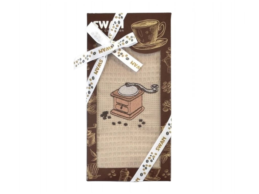 Stylová utěrka SWAN Mlýnek v hnědé barvě s motivem mlýnku na kávu. Vyrobena ze 100% bavlny, rozměr 50×70 cm. Elegantní dárkové balení – skvělý tip na dárek pro milovníky kávy.