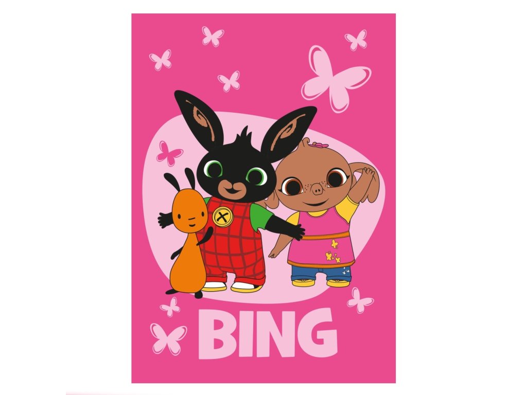 Hebká a hřejivá dětská deka s motivem Králíčka Binga, Flopa a Suly je ideální pro každodenní použití. Růžové pozadí s motýlky a výrazným nápisem "BING" potěší každého malého fanouška této oblíbené pohádky. Rozměr 100×150 cm je perfektní na přikrytí, hraní i odpočinek.