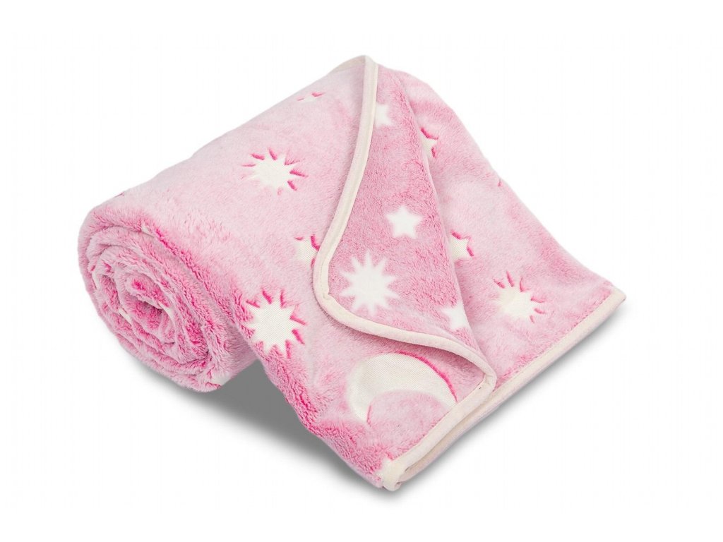 Dětská mikroplyšová deka Hvězdy růžové, která ve tmě svítí. Rozměr deky je 150x100 cm.
