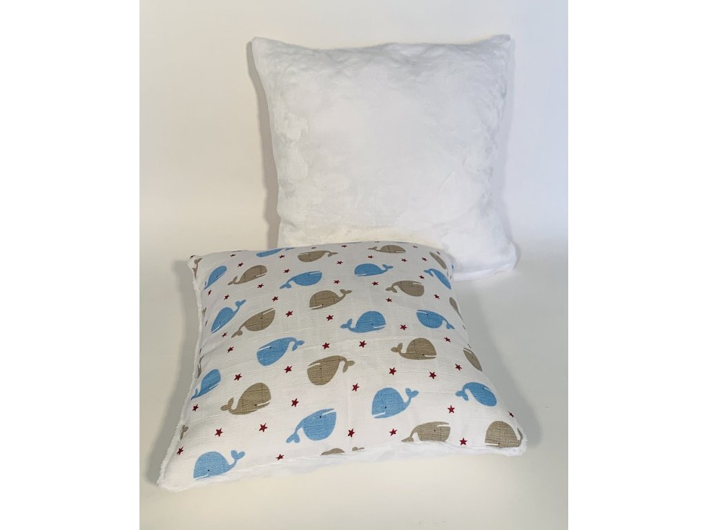 Dětská sada Velryba modrá – hebká a praktická sada pro batolata s roztomilým motivem velryby. Obsahuje polštářek 35x35 cm a deku 90x100 cm. Ideální na spaní i hraní.