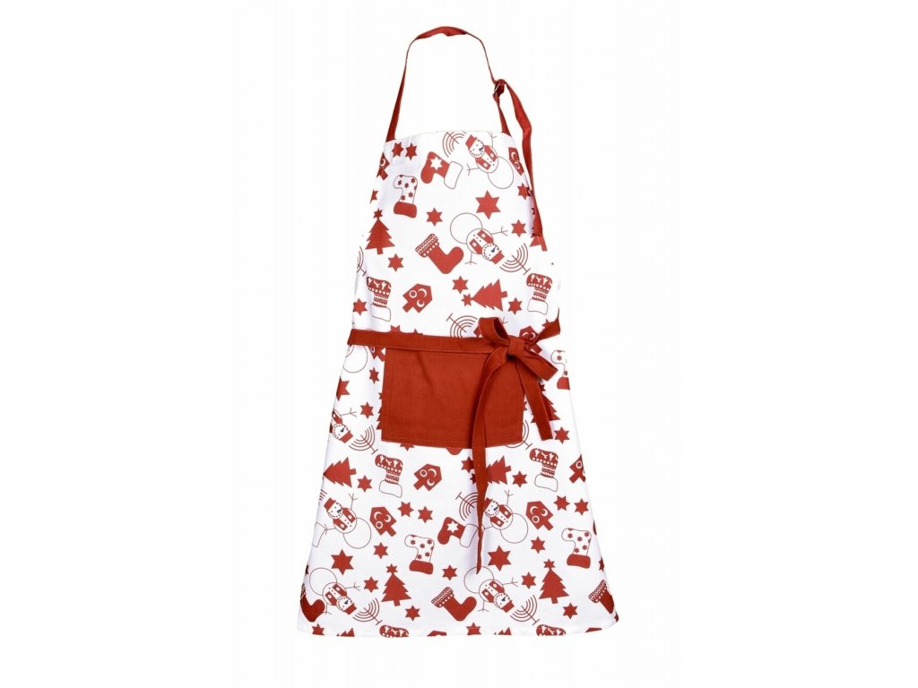 Vánoční dětská zástěra Mikuláš červená s motivy stromečků, sněhuláků a perníčků. Praktická kapsa, nastavitelné šňůrky, 100% bavlna, rozměr 50×70 cm. Ideální na tvoření i vaření.
