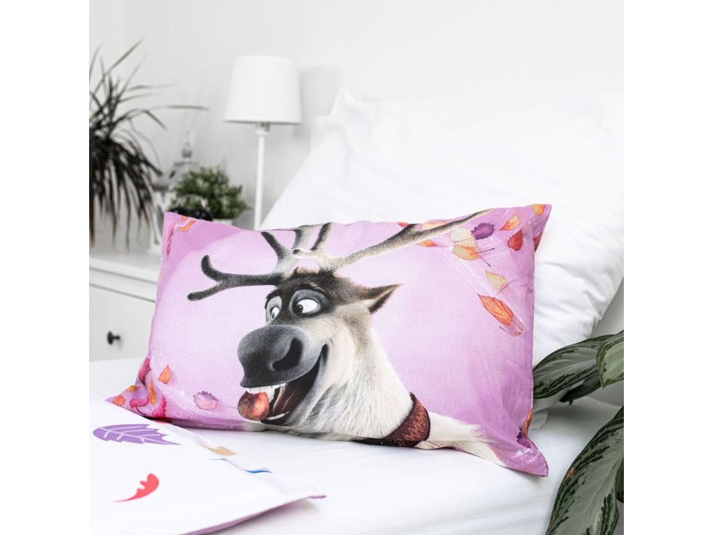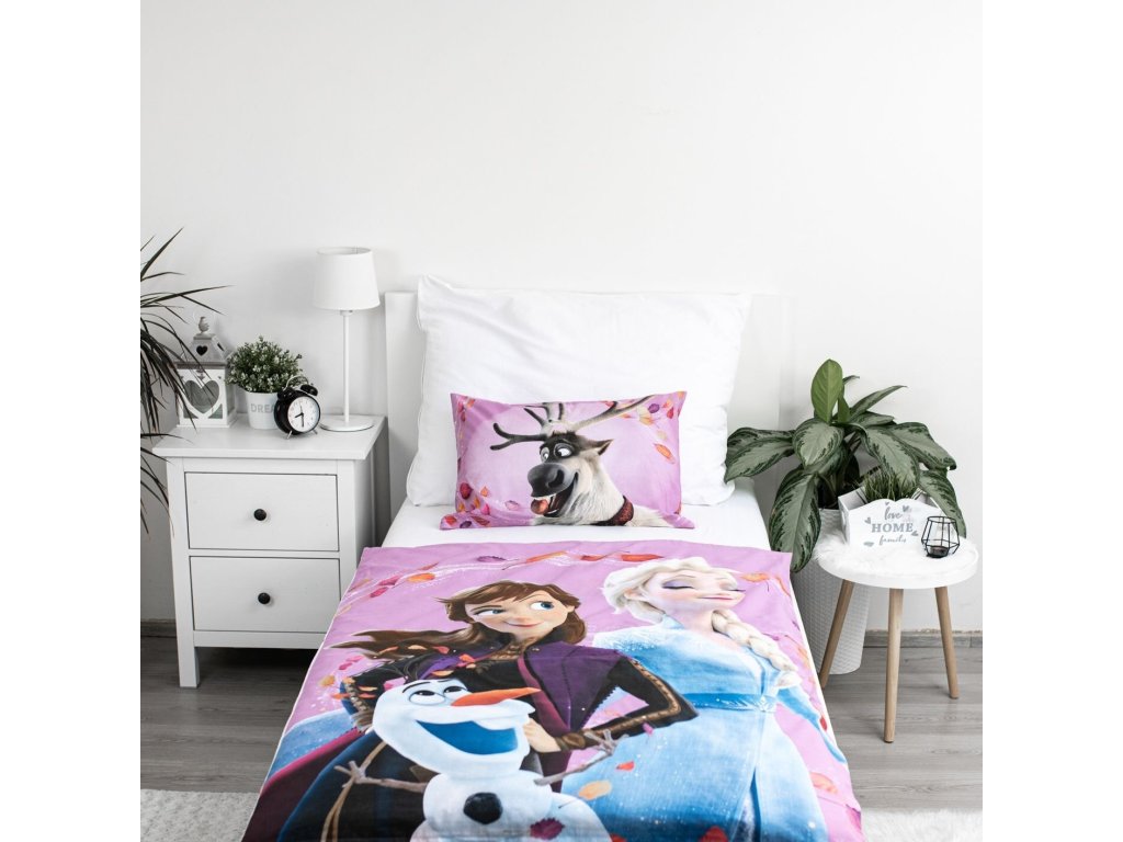 Obdarujte své dítě pohádkovým povlečením s motivem Frozen 2, které přinese radost, pohodlí a kouzelnou atmosféru. Přikrývku zdobí Elsa v ikonických modrých šatech, Anna v elegantním fialovém plášti a roztomilý sněhulák Olaf – vše na jemně růžovém pozadí s barevnými listy. Polštářek doplňuje veselý portrét soba Svena, který dodává celému setu hravý šarm.