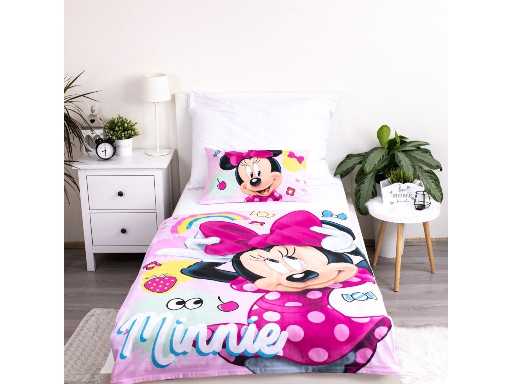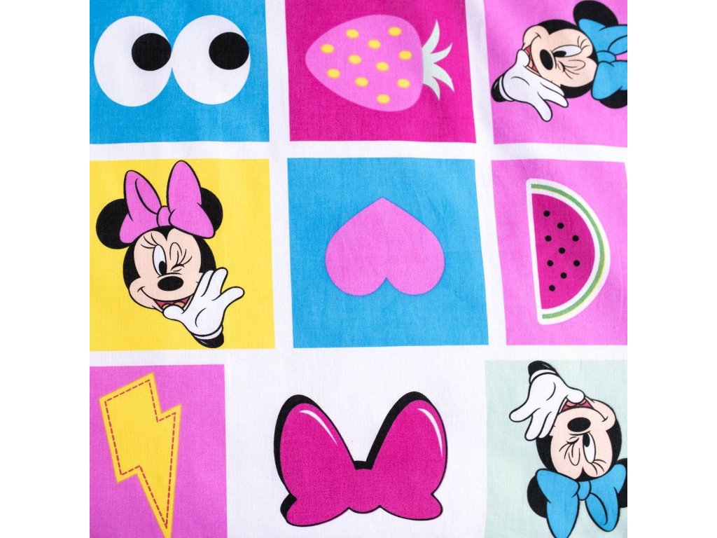 Na přední straně povlečení se nachází velký obrázek Minnie Mouse v růžových šatech s puntíky a velkou mašlí na hlavě, která dodává celému designu hravost a veselost.