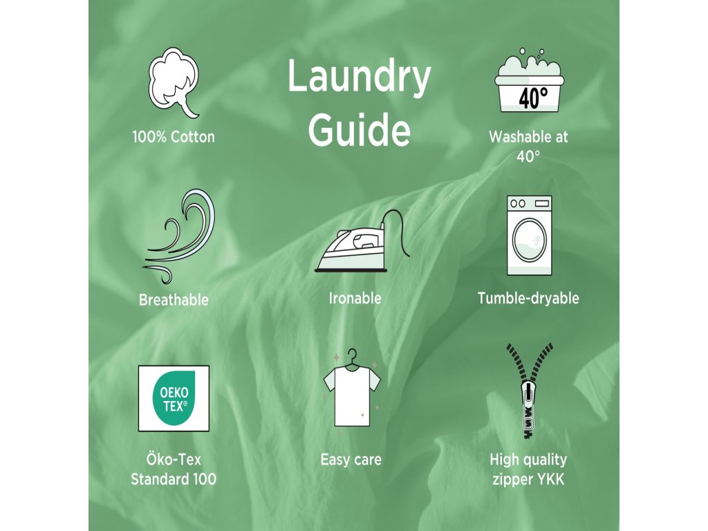 Doporučená údržba: Před prvním použitím vyperte povlečení samostatně. Barevné prádlo doporučujeme prát v prostředku na jemné a barevné prádlo v nepřeplněné pračce max. na 40 °C a sušit v závěsu nebo v sušičce s programem na nízkou teplotu. Maximální kvalitu a jemnost prádla Vám zaručí praní zásadně po rubu se zapnutým zipem. Teplota žehlící plochy nejvýše na 110 °C. Povlečení se nesmí bělit a chemicky čistit.