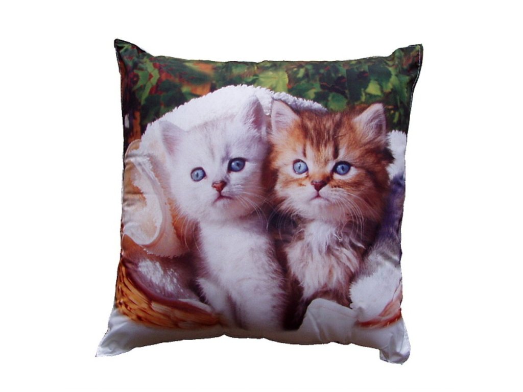 Okouzlující polštářek s fototiskem dvou koťátek – jedno bílé a druhé hnědobílé, obě s modrýma očima. Sedí spolu v košíku vystlaném měkkou dekou, obklopeny zeleným pozadím. Motiv působí něžně a harmonicky.