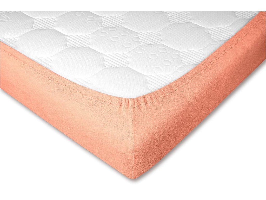 Meruňkové napínací froté prostěradlo je vyrobeno z kvalitní směsi 80 % česané bavlny a 20 % polyesteru. Tento materiál je pružný, rozměrově stálý, prodyšný a příjemný na dotek. Hebká froté smyčka dodává prostěradlu jemnost a komfort po celý rok.