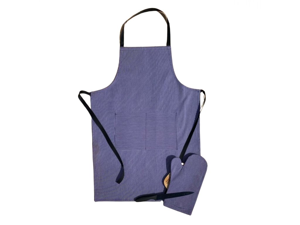 Zástěru s jemným modrým proužkem, vyrobenou z kvalitního a odolného materiálu. Je vybavena praktickými kapsami na přední straně pro uložení grilovacích nástrojů, koření nebo utěrky.