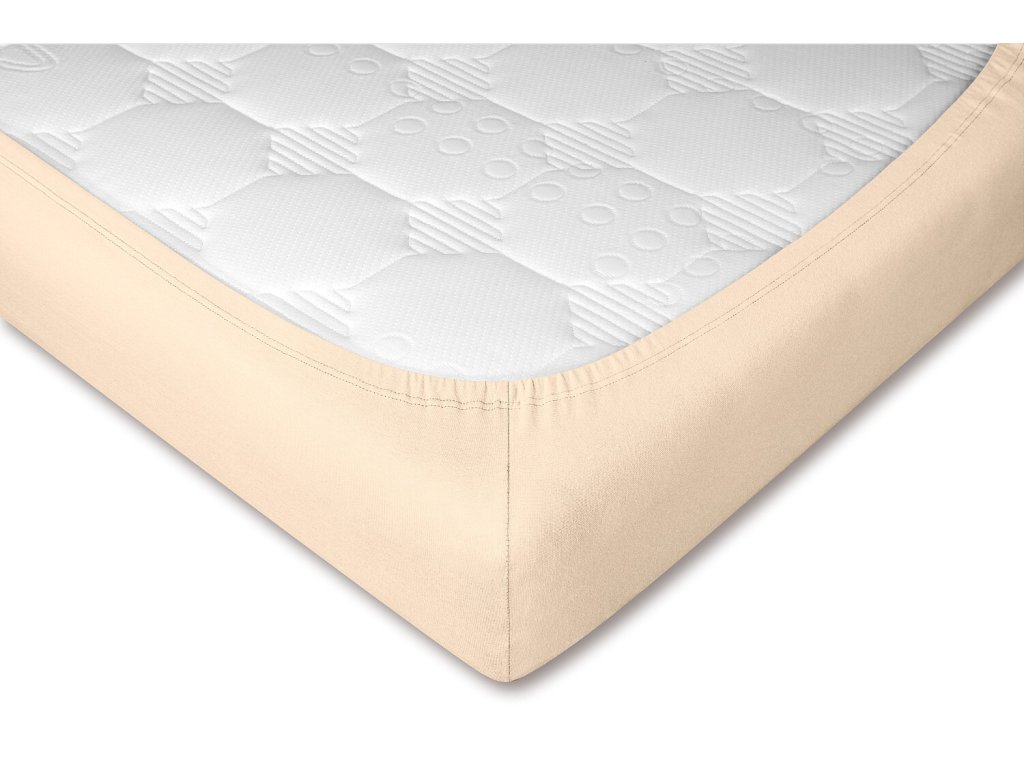 Smetanové napínací jersey prostěradlo s gumou v tunýlku. Vysoce elastická bavlna s elastanem, gramáž 190 g/m². Česká výroba. Perfektně sedí a nevyžaduje žehlení.