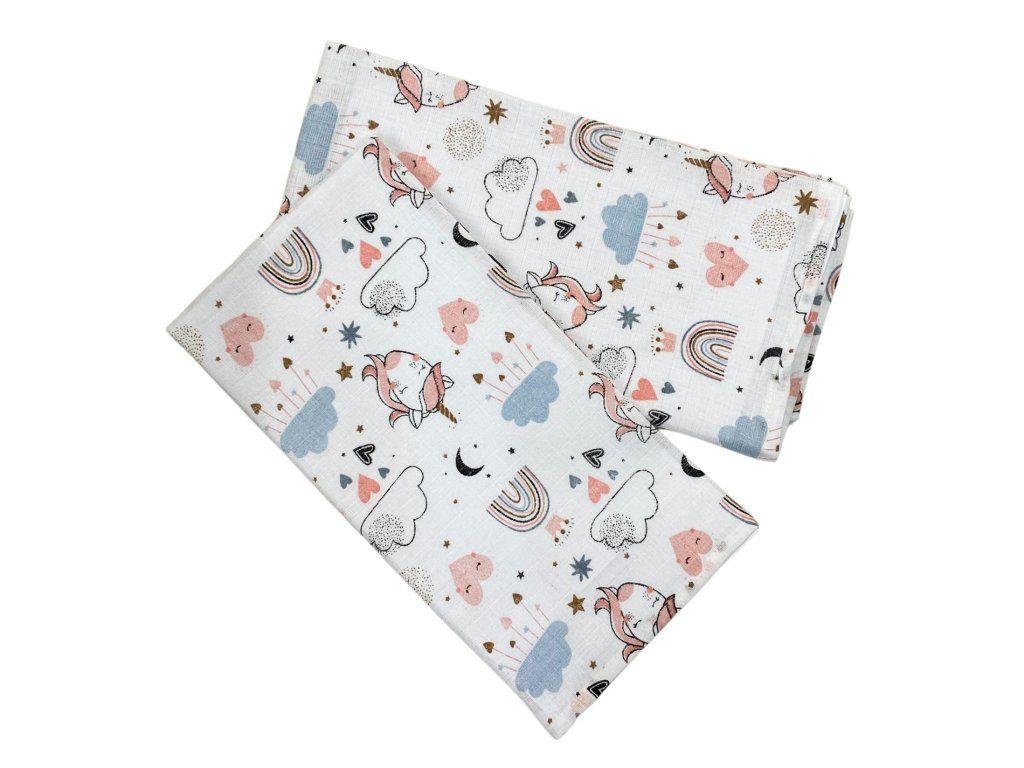 Látkové pleny jsou jemné, měkké a prodyšné, se vzorem jednorožce. Rozměr pleny je 70x70 cm, balení obsahuje 5 ks.