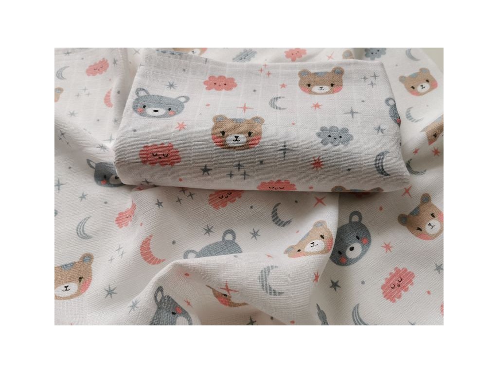 Látkové pleny jsou jemné, měkké a prodyšné, se vzorem medvídka a mráčků. Rozměr pleny je 70x70 cm, balení obsahuje 5 ks.