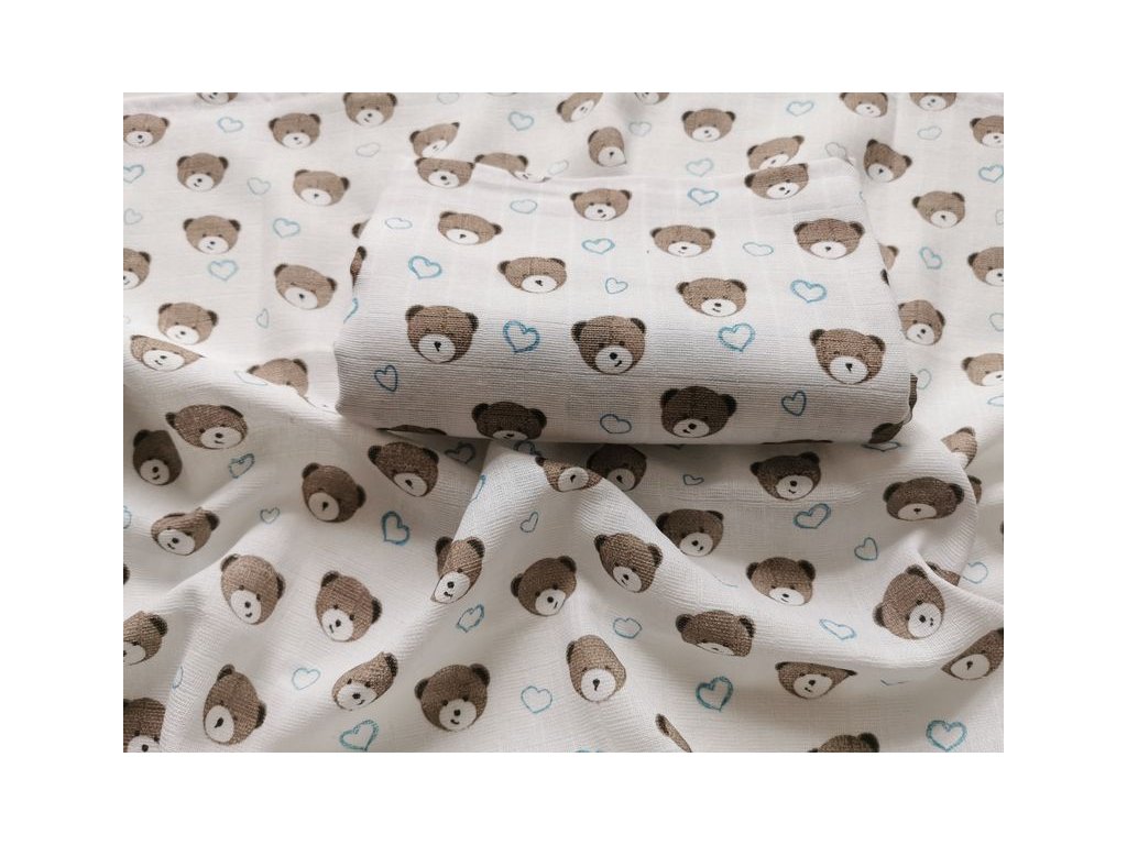 Látkové pleny jsou jemné, měkké a prodyšné, se vzorem medvídka a srdíček. Rozměr pleny je 70x70 cm, balení obsahuje 5 ks.