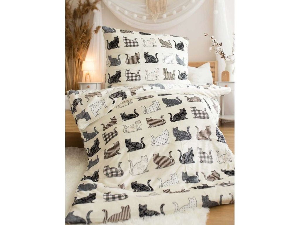 Hřejivé a jemné povlečení Mikroflanel Kočky s roztomilým motivem v neutrálních tónech. Hebký materiál, rychleschnoucí, vhodný pro alergiky. Ideální na zimní období, se zipovým zapínáním. Rozměr povlečení je 140x200, 70x90 cm.