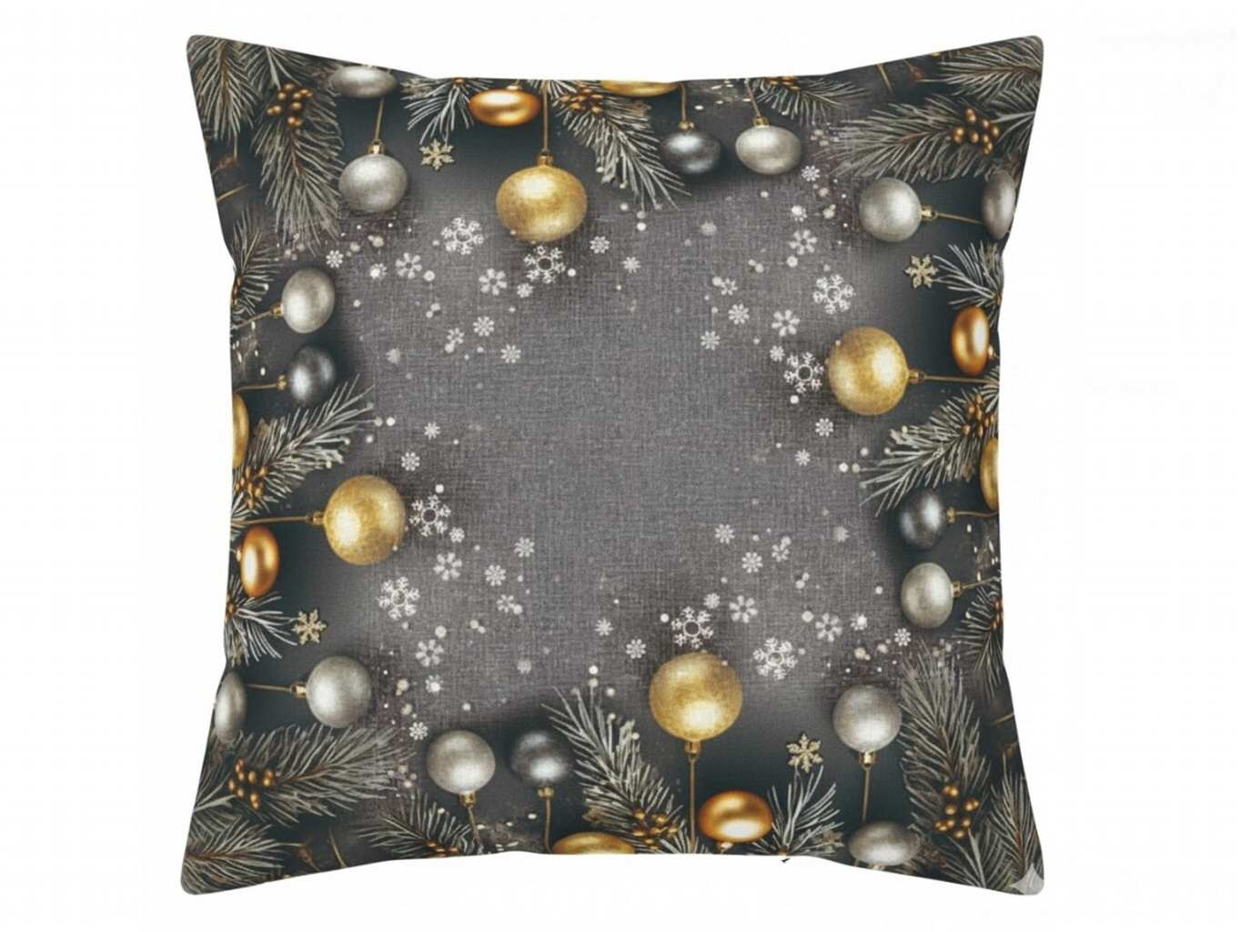 Rozměr: 40×40 cmMotiv: Jehličí, vánoční baňky, sněhové vločkyMateriál: 100% polyesterZapínání: zipBarva: tmavě šedá s barevnými dekoracemi (zlatá, stříbrná, bronzová)