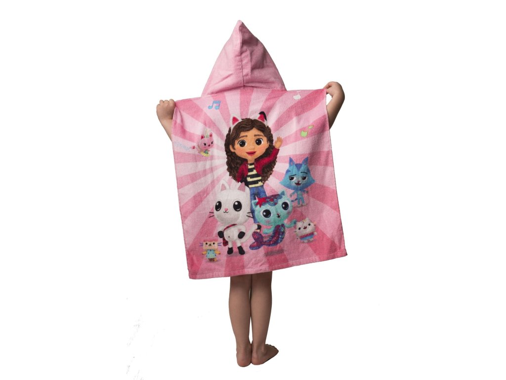 Dětské pončo Gabby's Dollhouse 02 50×115 cm s kapucí. Roztomilý motiv postaviček z Gabby's Dollhouse, hebké froté a praktické využití po koupání i na pláži potěší každého malého milovníka animovaných příběhů.