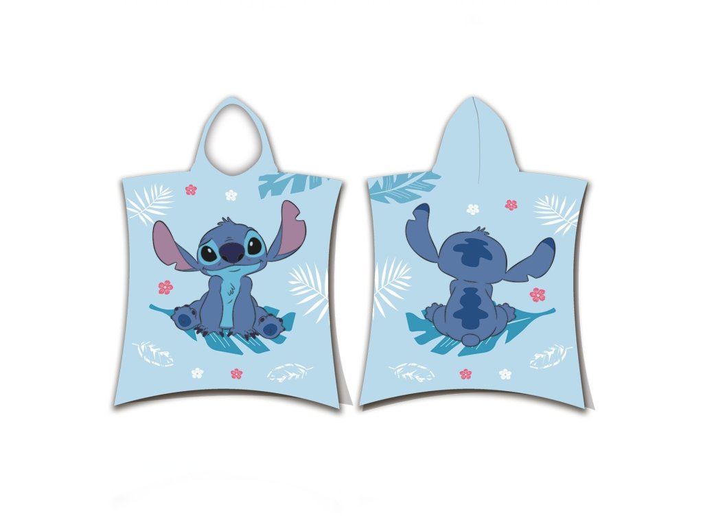Stylové pončo s motivem Lilo and Stitch přináší radost a pohodlí po každém koupání. Přední stranu zdobí sedící Stitch s veselým výrazem, zadní stranu sedící Stitch zezadu – vše na modrém podkladu s dekorativními prvky jako listy a květiny. Pončo je ideální jako osuška i župánek a díky kapuci krásně zahřeje.