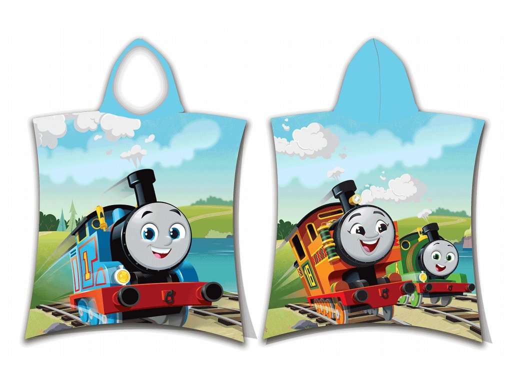 Dětské pončo Mašinka Tomáš 06 50×115 cm s kapucí. Roztomilý motiv Mašinky Tomáše, hebké froté a praktické využití po koupání i na pláži potěší každého malého milovníka vláčků.