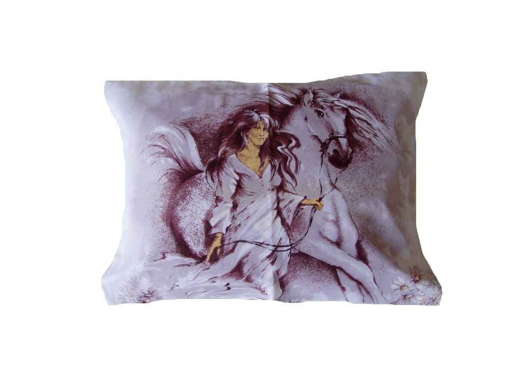 Polštářek s motivem jezdkyně. Rozměr plněného polštáře: 60x45 cm + polštář je ze 3 stran prošitý - má ozdobný lem (s lemem 70x50 cm).