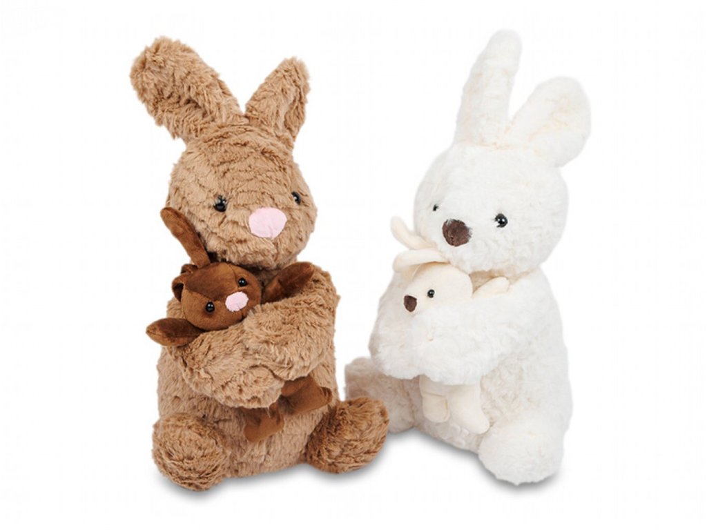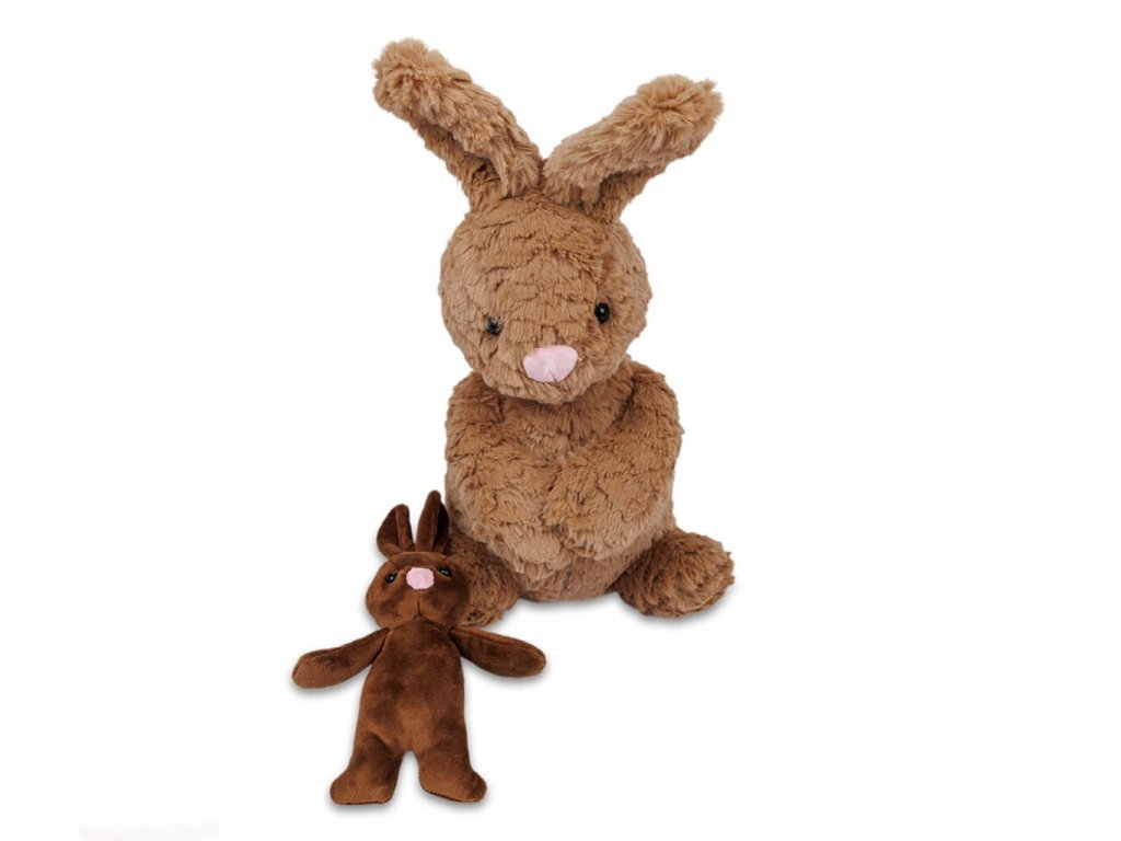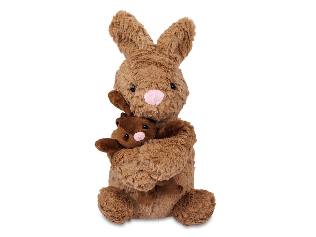 Roztomilý plyšový zajíc s mláďátkem v náručí. Hebký materiál, ideální na mazlení i jako dekorace. Snadná údržba, skvělý dárek pro děti i dospělé. V hnědé barvě.