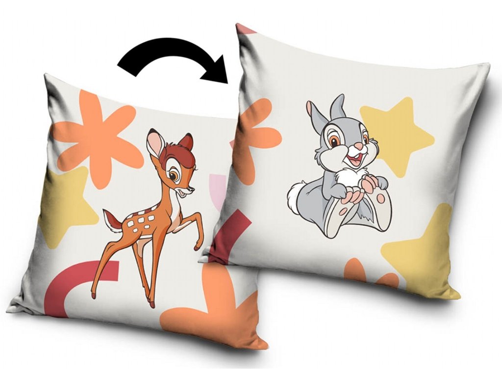 Roztomilý oboustranný polštářek s motivy z klasického Disney filmu Bambi. Na jedné straně je malý jelen Bambi obklopený květinovým pozadím v teplých tónech, na druhé straně jeho kamarád zajíček Dupík (Thumper) s hvězdičkami na žlutém pozadí. Ideální pro děti i milovníky Disney klasiky.