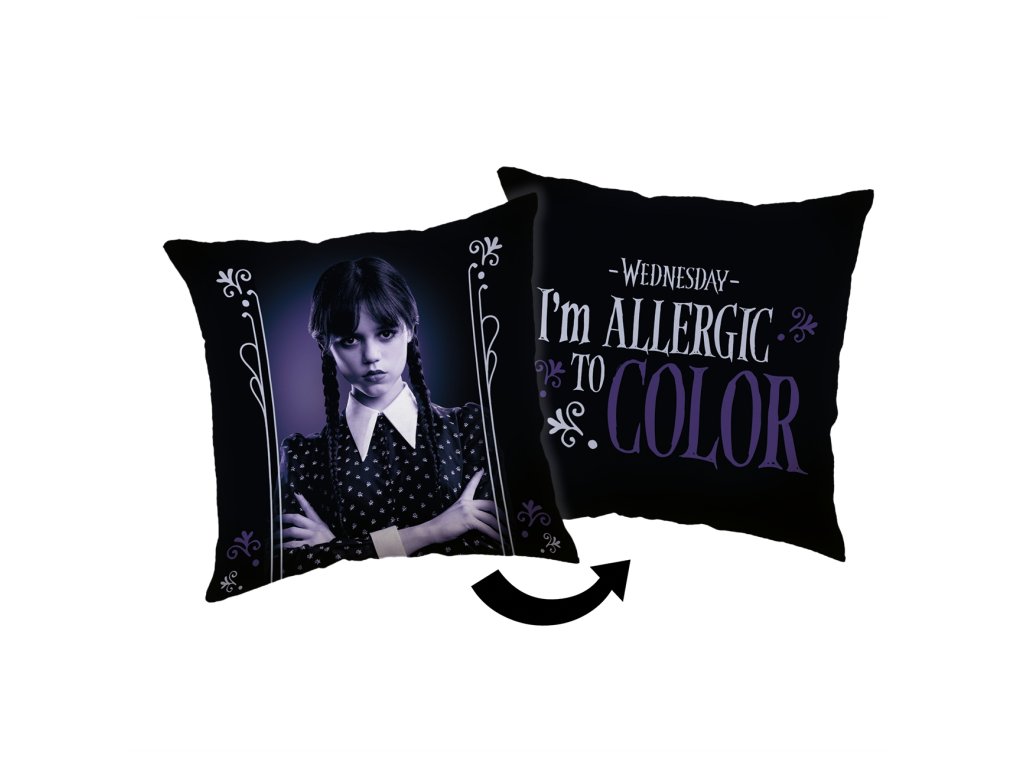 Stylový oboustranný polštářek inspirovaný postavou Wednesday Addams zaujme každého fanouška temného humoru a gotické estetiky. Jedna strana zobrazuje ikonickou siluetu dívky s copánky a bílým límečkem, druhá strana nese nápis „WEDNESDAY I'M ALLERGIC TO COLOR“. Rozměr 40×40 cm, ideální do pokoje teenagera nebo jako doplněk pro fanoušky seriálu.
