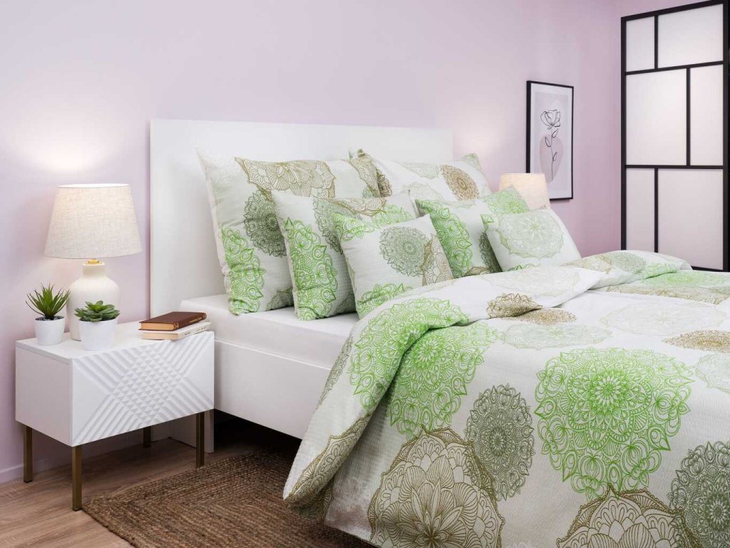 Elegantní povlak Magic světle zelená s bílým podkladem a zelenými mandalovými motivy. Vyroben z kvalitní krepové bavlny, příjemný na dotek a bez žehlení. Český výrobek.