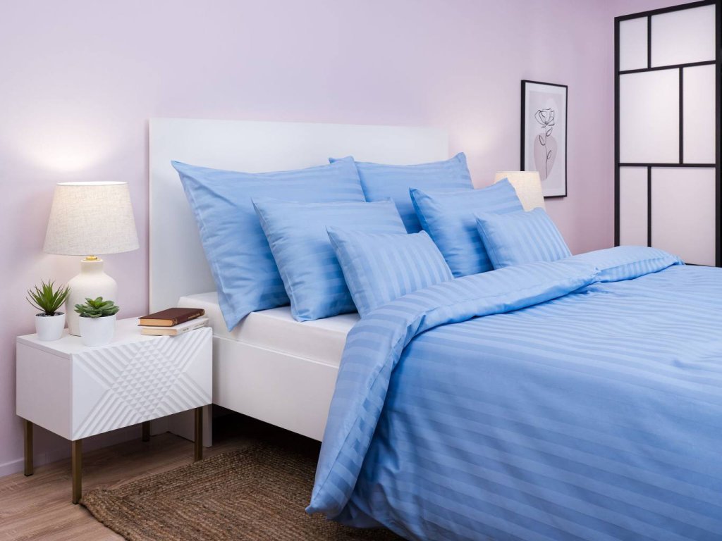 Povlečení s atlas grádlovou vazbou s proužky 2,5 cm v modré barvě. Rozměr povlečení je 140x200 70x90 cm.