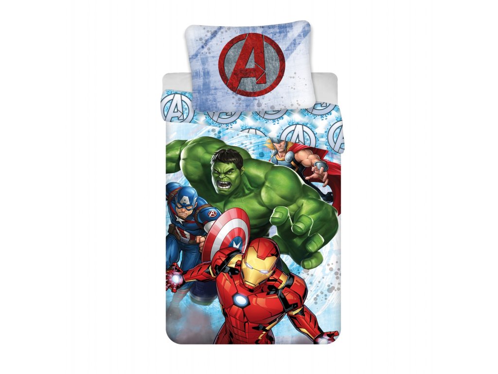 Dětské povlečení Avengers Heroes s Iron Manem, Hulkem, Thorem a Kapitánem Amerikou na modrém pozadí. Ideální pro malé fanoušky superhrdinů – pohodlí, styl a dobrodružství v jednom! Rozměr povlečení je 140x200, 70x90 cm.