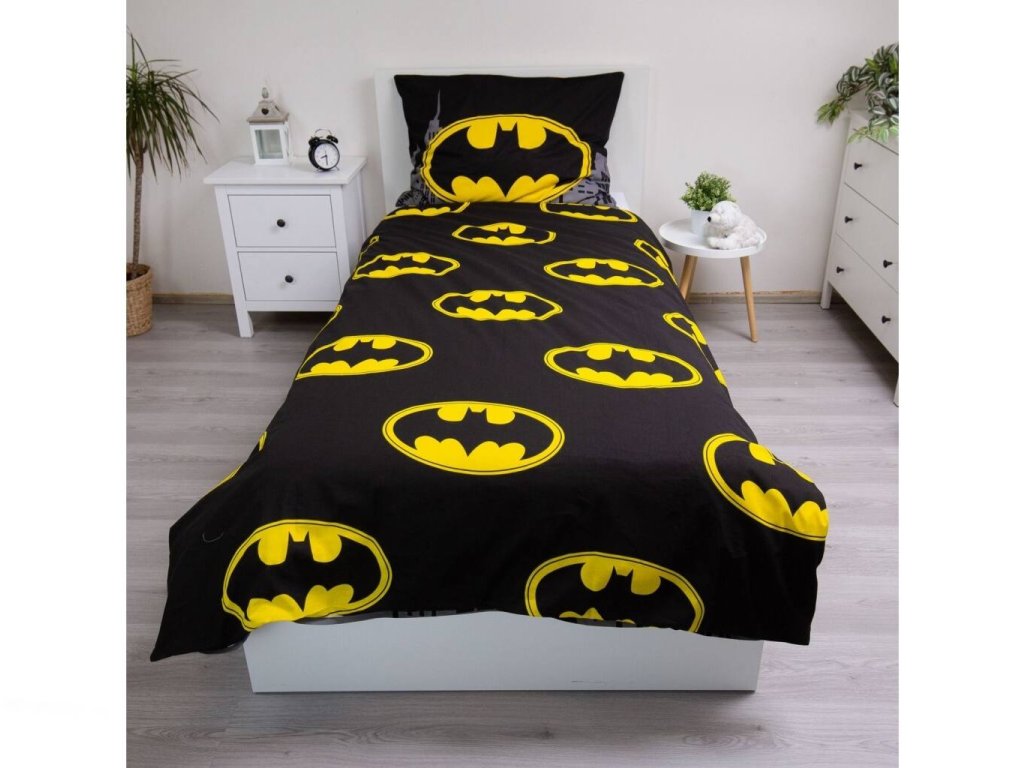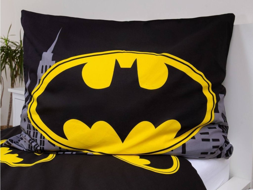 Stylové povlečení Batman The Emblem z jemné 100% bavlny. Moderní černý design se žlutým znakem Batmana dodá ložnici originální vzhled. Rozměr 140×200 cm + 70×90 cm, zapínání na zip, snadná údržba.