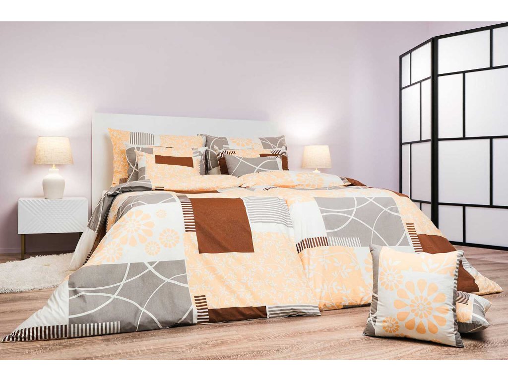 Stylové ložní prádlo Bluemoon nugát kombinuje květinové motivy s geometrickými prvky v odstínech nugátové, žluté, bílé a světle šedé. Tento moderní a zároveň elegantní design přináší do ložnice harmonii a teplý nádech. Povlečení doporučujeme kombinovat s prostěradly v barvě bílá, světle šedá, nugátová nebo okrová. Vyrobeno v České republice firmou DADKA VRACOV.