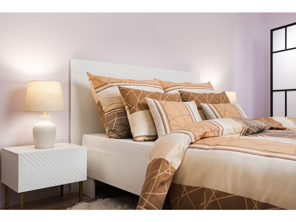 Moderní ložní prádlo s geometrickým vzorem Bruno opál v odstínech béžové a bílé přináší do ložnice decentní eleganci a klid. Vzor tvoří jemné linie a pruhy, které působí harmonicky a nadčasově. Povlečení doporučujeme kombinovat s prostěradly v barvě opálová, medová, banánová nebo bílá. Vyrobeno v České republice firmou DADKA VRACOV.