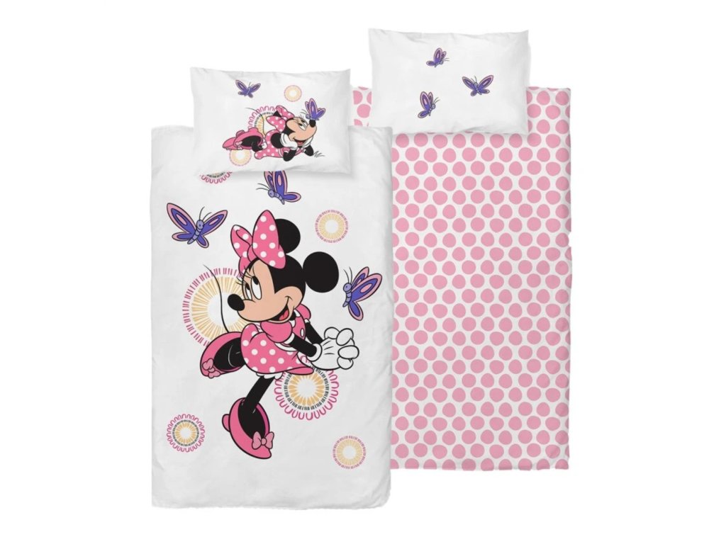Sada obsahuje povlak na peřinu a polštář, oba zdobené veselým a barevným designem. Povlak na peřinu má bílý podklad s velkým obrázkem Minnie Mouse v růžových šatech a mašli, obklopenou fialovými motýly a květinovými vzory. Polštář je také bílý s menším obrázkem Minnie a motýly. Zadní strana povlaku na peřinu je pokryta růžovými puntíky na bílém pozadí, což dodává celému setu hravost a kouzlo.