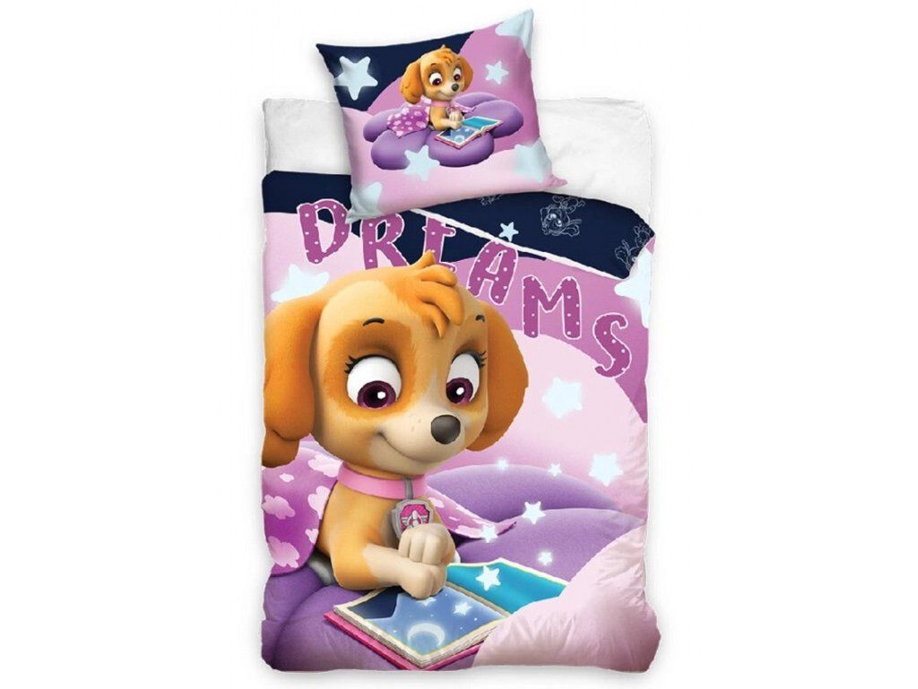 Povlečení je zdobeno obrázkem Skye, jedné z hlavních postaviček, která sedí na polštáři a čte knihu. Motiv je doplněn nápisem "DREAMS" a hvězdičkami, které dodávají celému designu kouzelnou atmosféru.