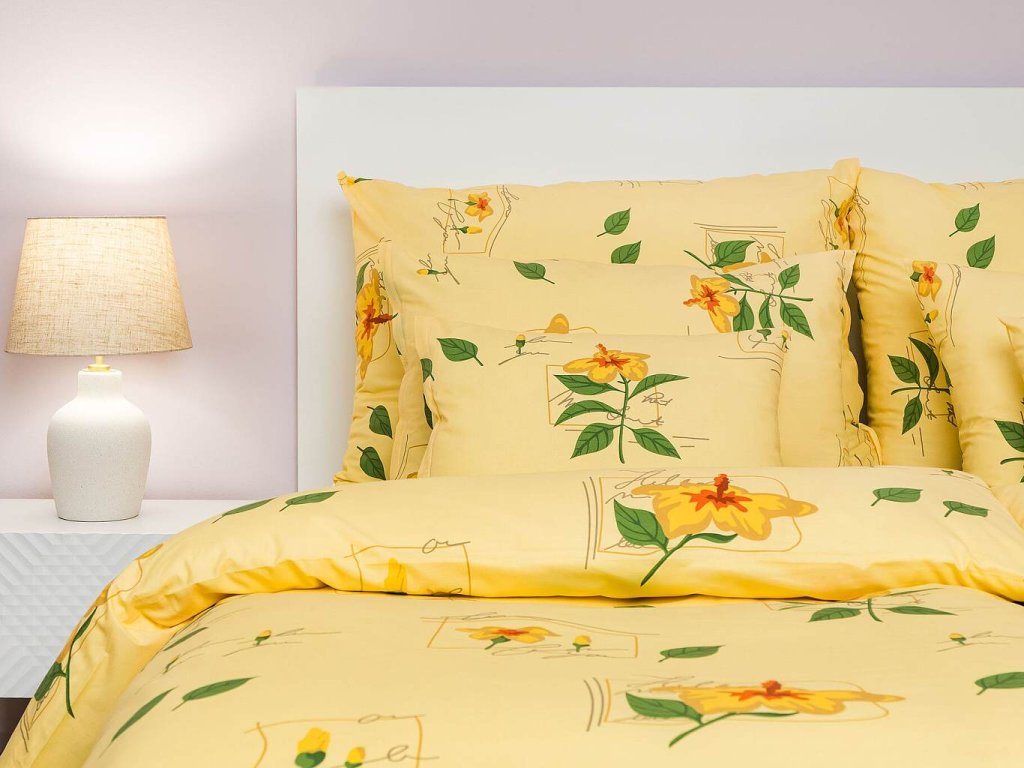 Jemné ložní prádlo Ibišek žlutý s motivem žlutých květů ibišku a zelených lístků na světle žlutém podkladu přináší do ložnice slunečnou atmosféru a přírodní klid. Povlečení doporučujeme kombinovat s prostěradly v barvě banánová nebo opálová. Vyrobeno v České republice firmou DADKA VRACOV.