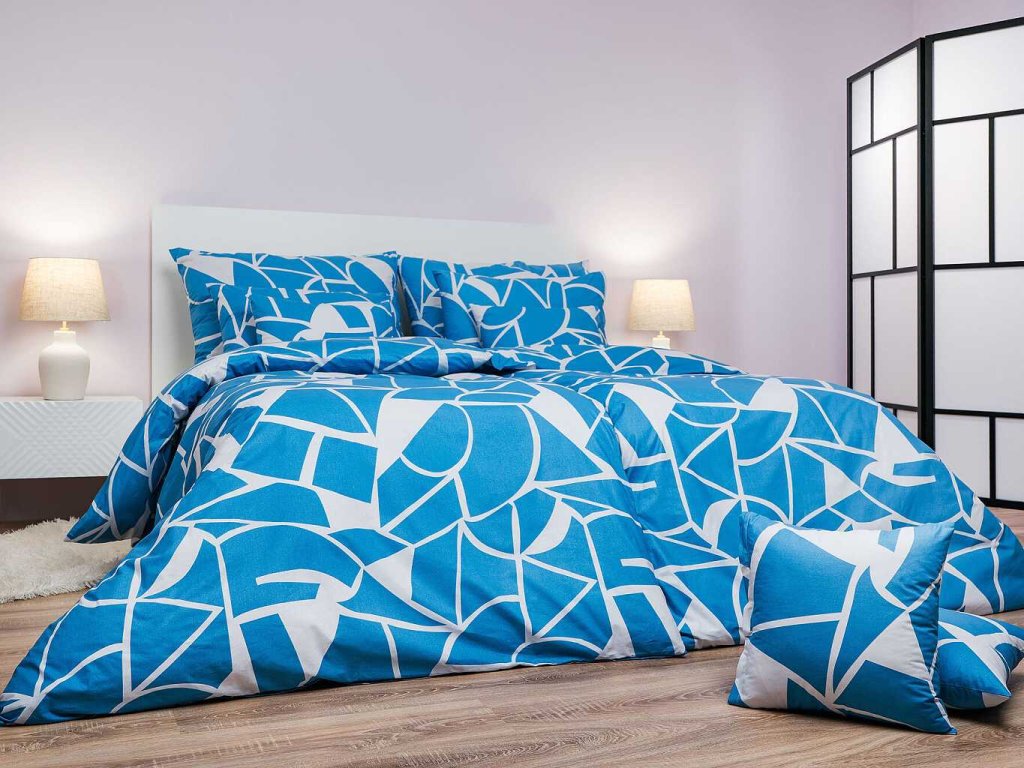 Moderní ložní prádlo Julius modrý s abstraktním vzorem v modré barvě na bílém podkladu přináší do ložnice svěžest a styl. Kombinace modrých tvarů a čistého pozadí působí elegantně a nadčasově. Povlečení doporučujeme kombinovat s prostěradly v barvě bílá, denim, šedá nebo stříbrná. Vyrobeno v České republice firmou DADKA VRACOV.