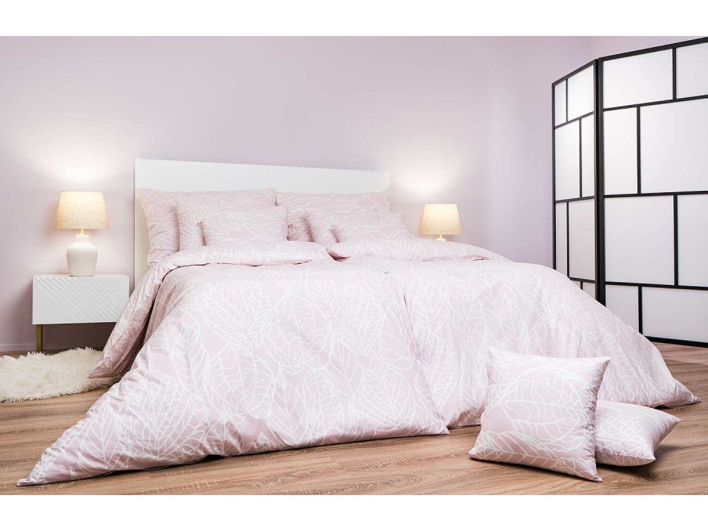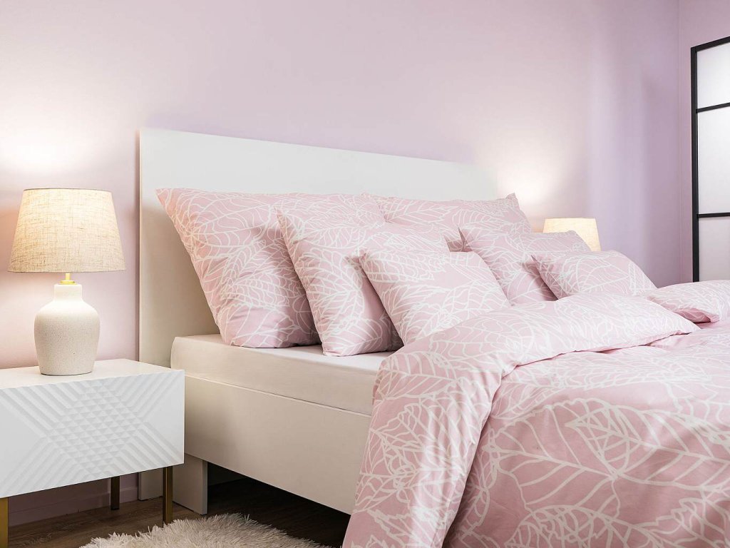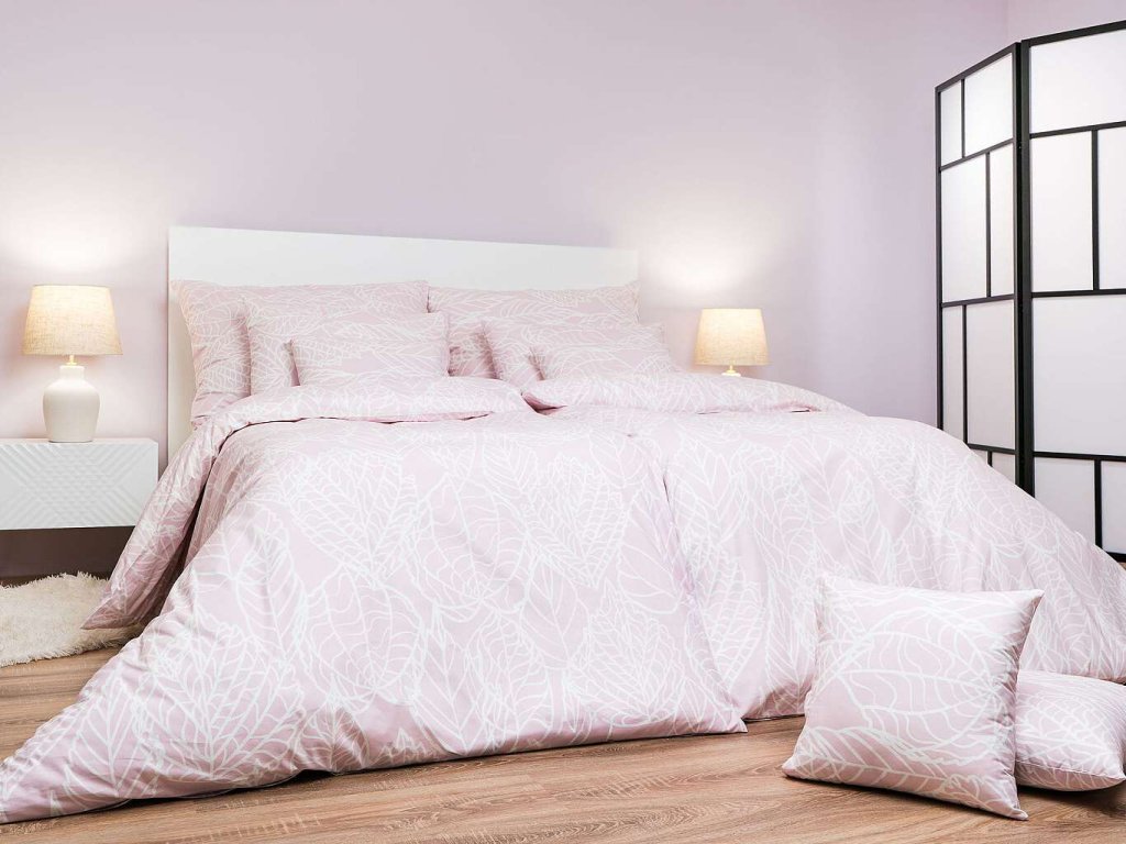 Elegantní bavlněné povlečení Max pudrový s jemným bílým listovým vzorem na pudrově růžovém podkladu vnese do vaší ložnice klid a jemnost. Doporučujeme kombinovat s prostěradly v barvě bílá nebo pudrová pro harmonický vzhled.