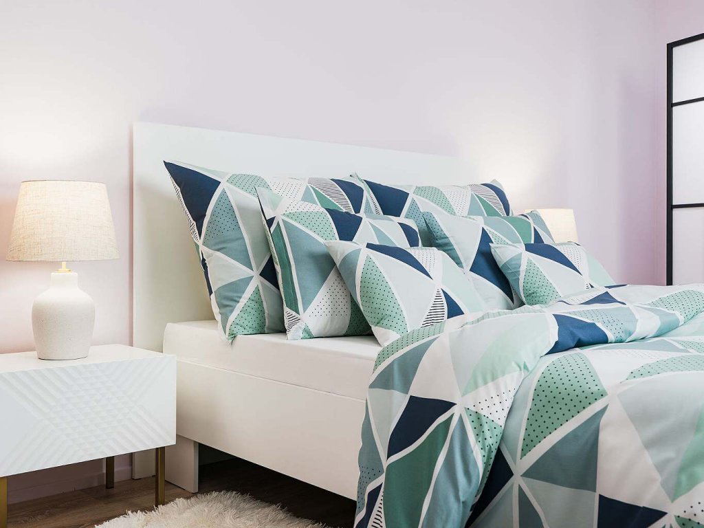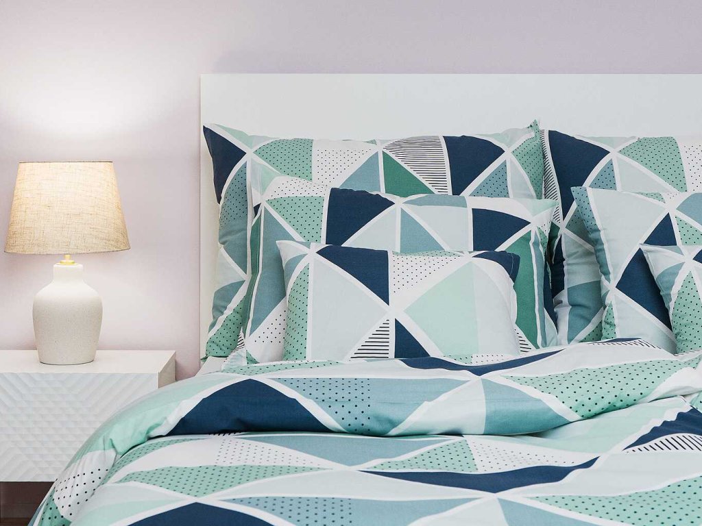 Moderní ložní prádlo Pyramidy mentol s geometrickým vzorem tvořeným trojúhelníky v odstínech mentolové, bílé a tmavě šedé dodá vaší ložnici svěží a stylový vzhled. Doporučujeme kombinovat s prostěradly v barvě bílá, mentolová nebo tmavě šedá. Vyrobeno v České republice firmou DADKA VRACOV.