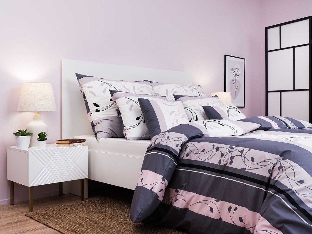 Elegantní ložní prádlo Slezsko šedo-pudrové s decentním vzorem v kombinaci šedé a pudrově růžové barvy přináší do ložnice jemnou, klidnou a harmonickou atmosféru. Nejlépe vynikne v kombinaci s prostěradlem v barvě světle šedá, pudrová, bílá nebo banán. Vyrobeno v České republice firmou DADKA VRACOV.