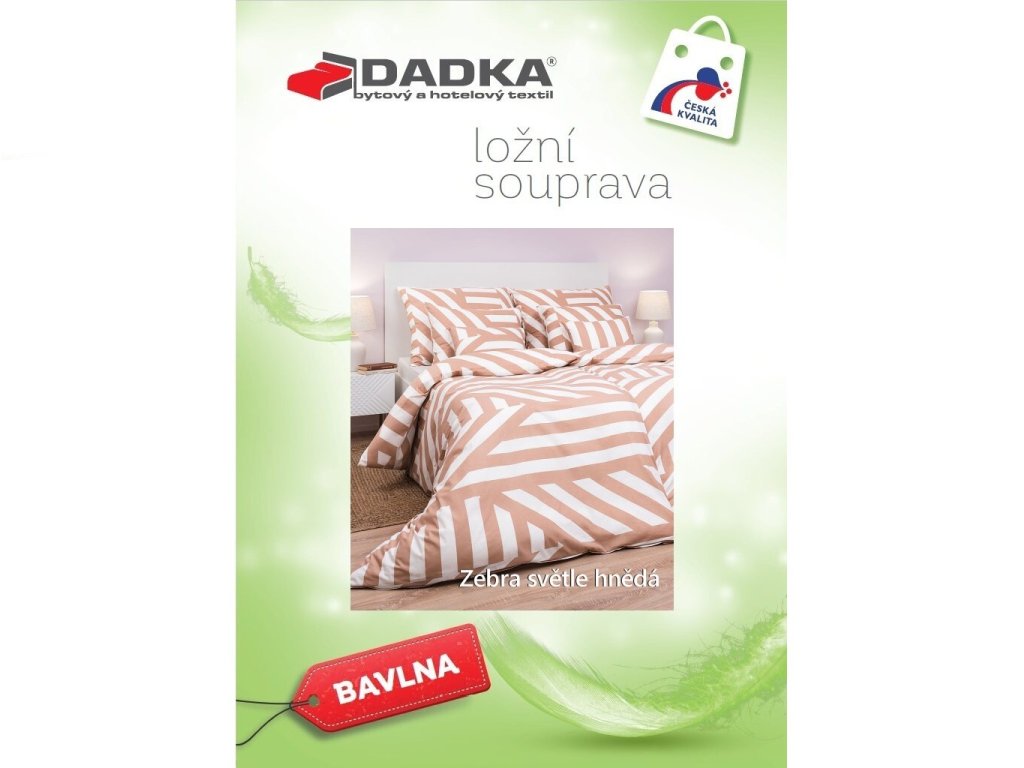 Stylové ložní prádlo Zebra světle hnědá přináší do vaší ložnice harmonii přírody a jemný nádech exotiky. Vzor inspirovaný zebří srstí v odstínech světle hnědé a bílé působí klidně a zároveň originálně. Tento decentní, ale výrazný design doporučujeme kombinovat s prostěradly ve světle hnědé, bílé nebo banánové barvě. Vyrobeno v České republice firmou DADKA VRACOV.