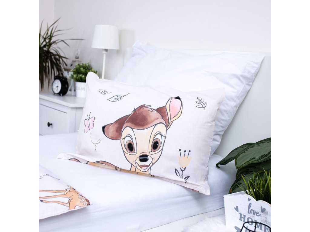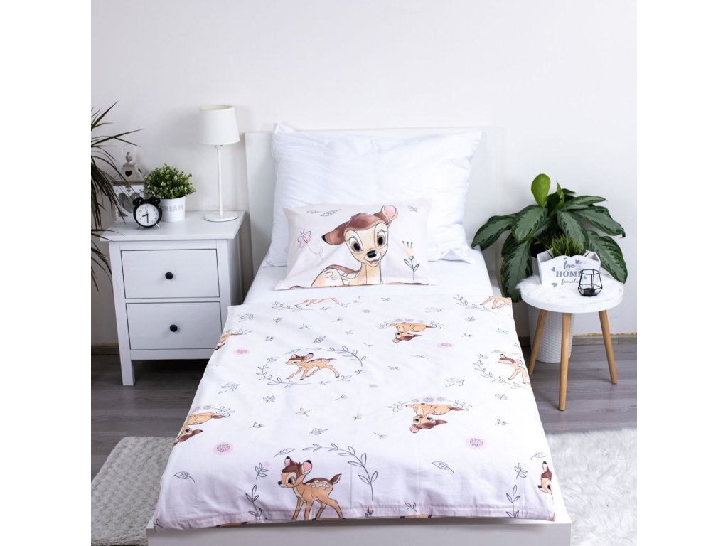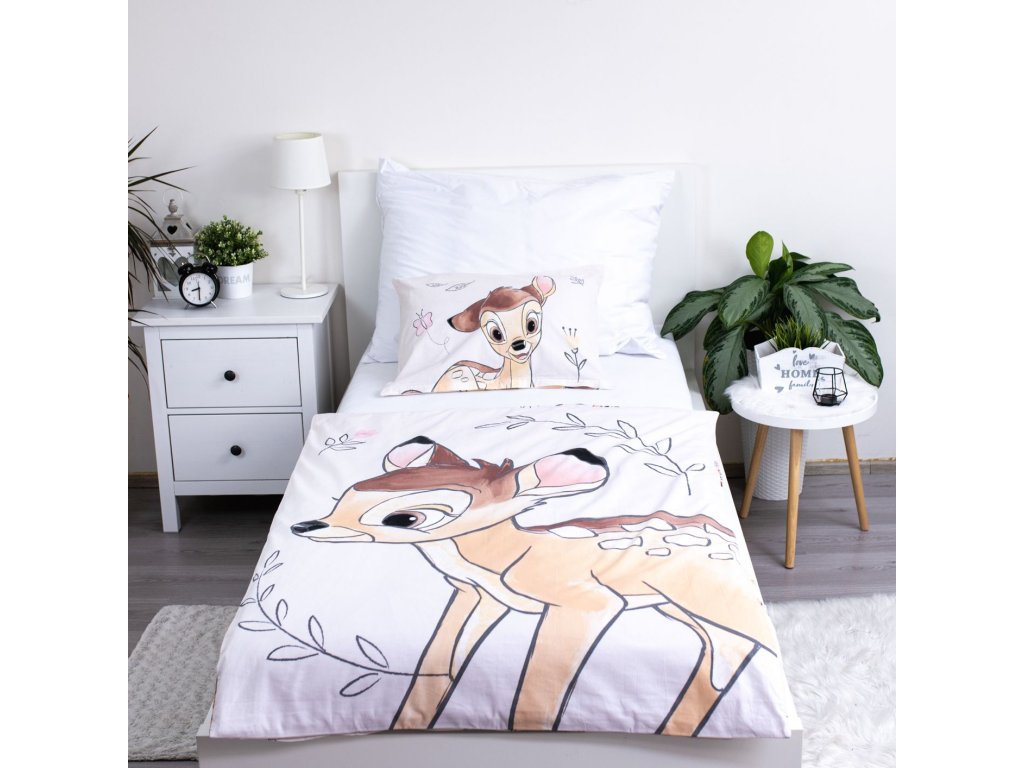 Vytvořte útulné prostředí pro vaše dítě s povlečením, které spojuje něhu, kvalitu a oblíbený motiv z Disney pohádek. Přikrývku i polštář zdobí krásná ilustrace Bambiho doplněná jemnými květinovými vzory. Pastelové barvy dodávají dětskému pokojíčku klidnou a příjemnou atmosféru.