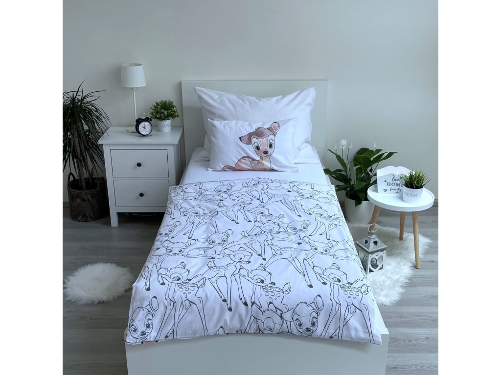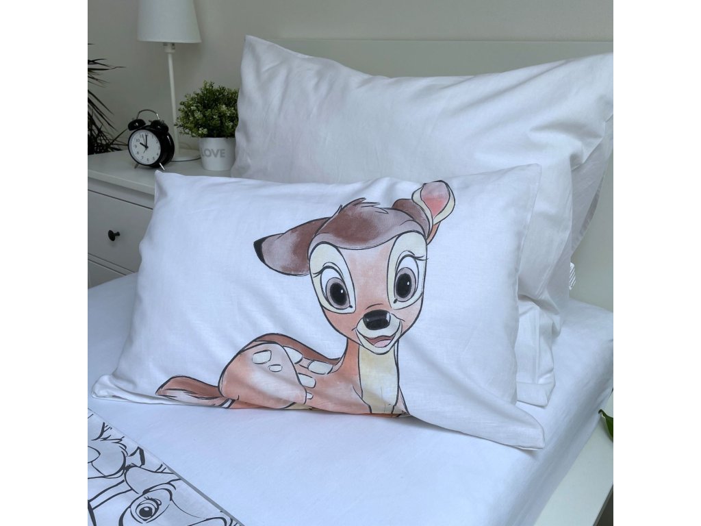 Vytvořte svému dítěti pohádkovou atmosféru s povlečením, které si zamilují všichni malí snílci. Na přední straně povlaku na přikrývku se nachází velký obrázek usměvavého kolouška Bambiho, který působí velmi přátelsky. Stejný motiv zdobí i polštář, což dodává celému setu jednotný a harmonický vzhled.