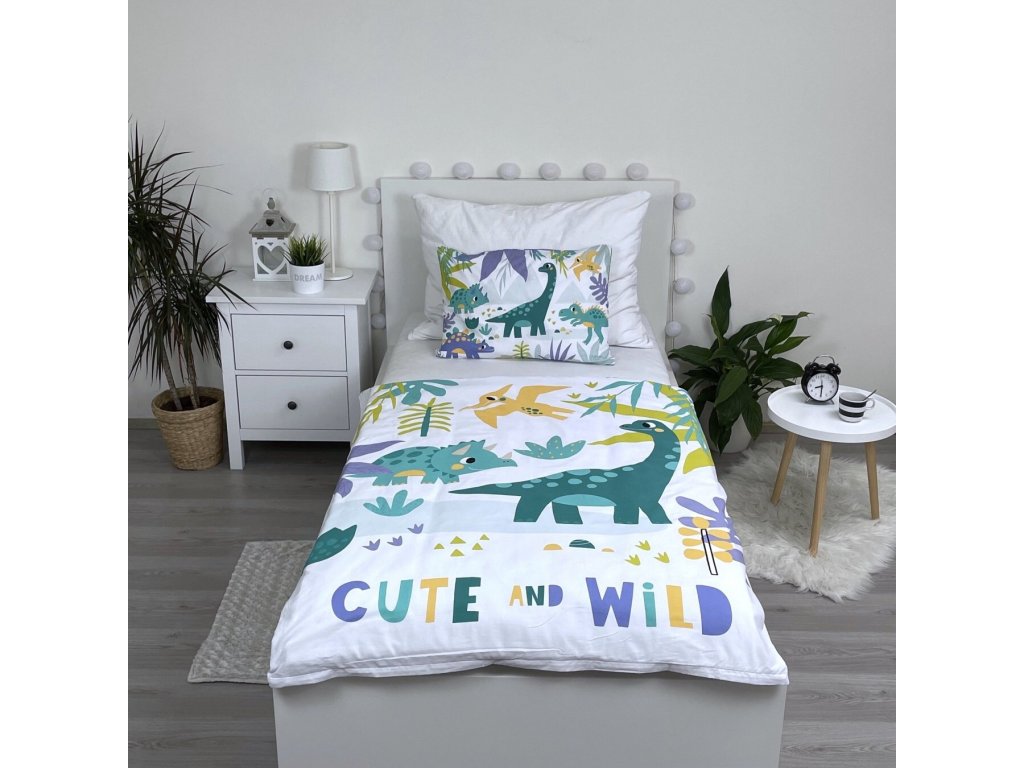 Veselé dětské povlečení s motivem roztomilých dinosaurů v přírodním prostředí promění každé usínání v dobrodružství. Na bílém podkladu se vyjímají zelení, modří a žlutí dinosauři obklopení rostlinami a stromy. Nápis „CUTE AND WILD“ dodává celému designu hravý a přátelský vzhled.
