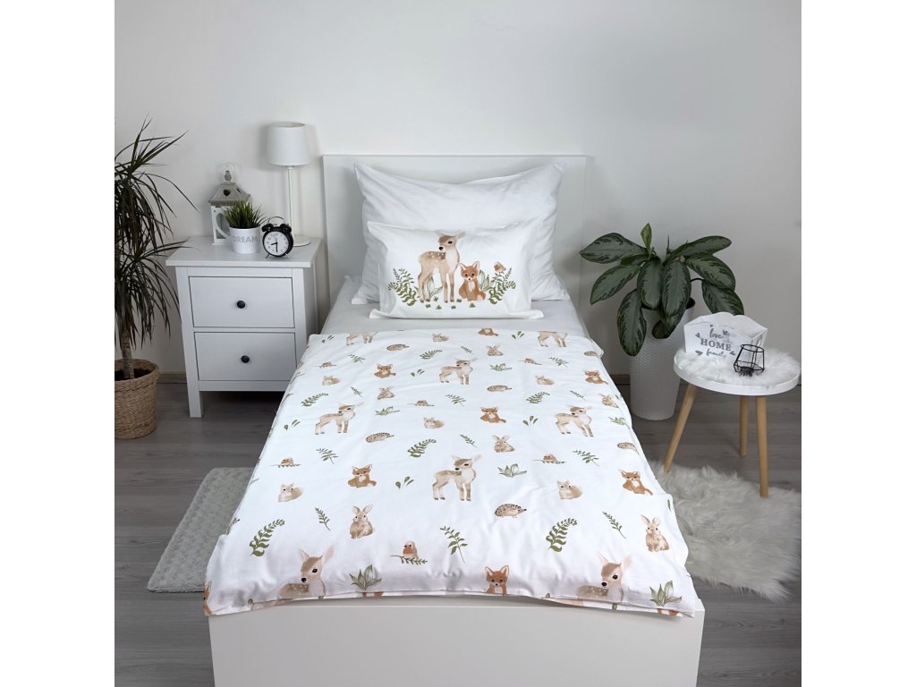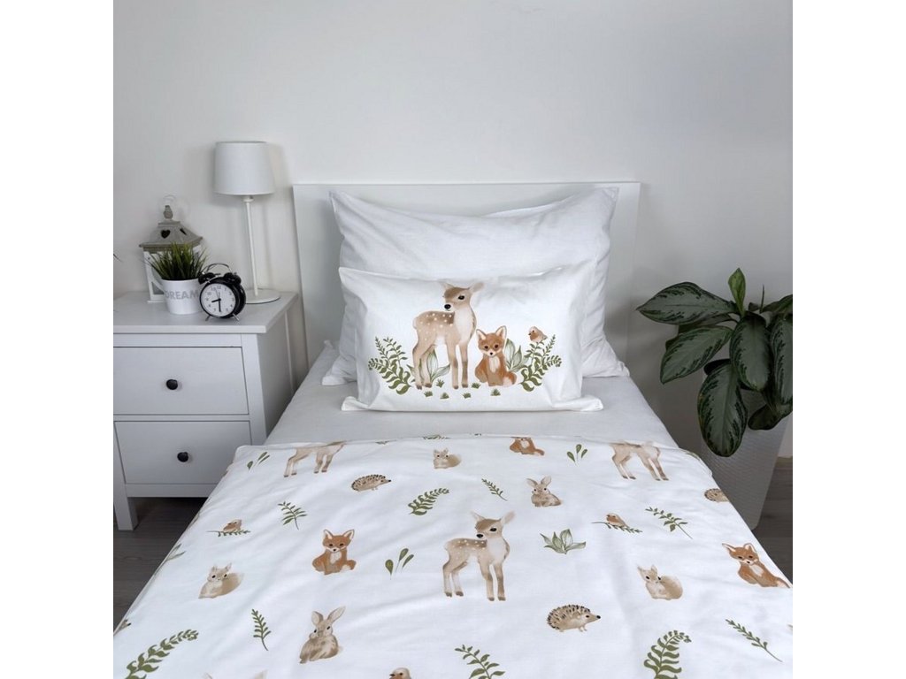 Roztomilé povlečení s motivem lesních zvířátek přinese do dětského pokojíčku klidnou a přátelskou atmosféru. Přikrývku i polštář zdobí ilustrace srnečků, lišek a ježků v různých pozicích, doplněné jemnými zelenými lístky a větvičkami. Harmonický design v pastelových barvách potěší každého malého milovníka přírody.