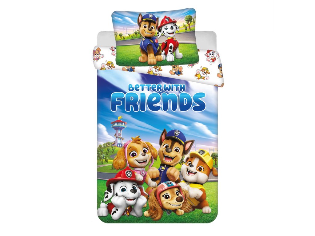 Zažijte dobrodružství s týmem Tlapkové patroly díky povlečení Paw Patrol 553! Design s postavičkami Marshall, Skye, Chase, Rubble a Zuma na pozadí Adventure Bay a nápisem „BETTER WITH FRIENDS“ přináší radost a přátelství do každé dětské postýlky.