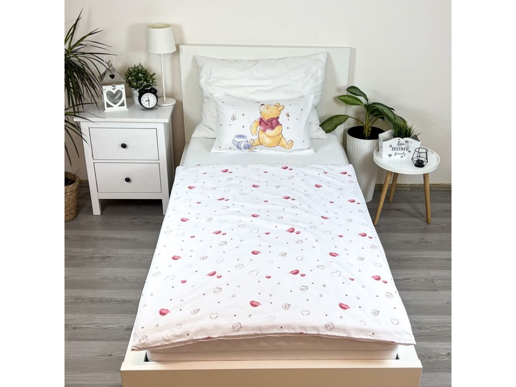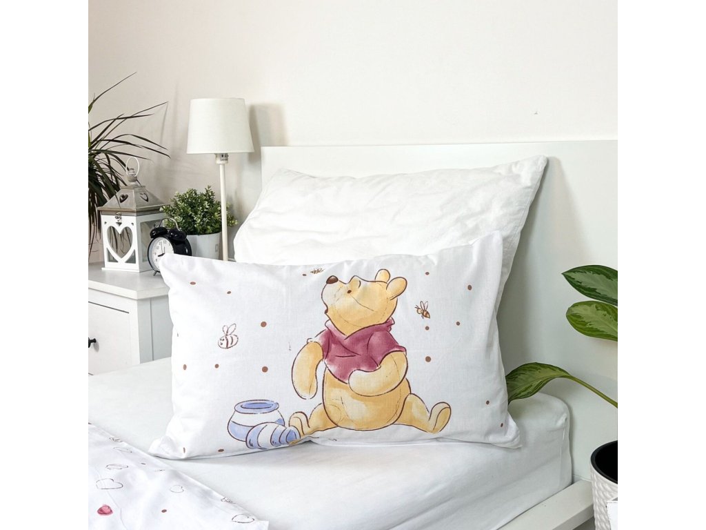 Oslavte narozeniny každý den s kouzelným povlečením WTP Birthday party baby! Design přináší oblíbené postavičky Medvídka Pú a Tygra v narozeninové atmosféře – Medvídek Pú drží cupcake a sedí vedle dárků, zatímco Tygr má narozeninovou čepici a dort se svíčkami. Povlak na polštář zdobí Medvídek Pú s medovým hrncem. Celý motiv doplňují srdíčka, hvězdičky a další drobné dekorace, které rozzáří každý dětský pokoj.