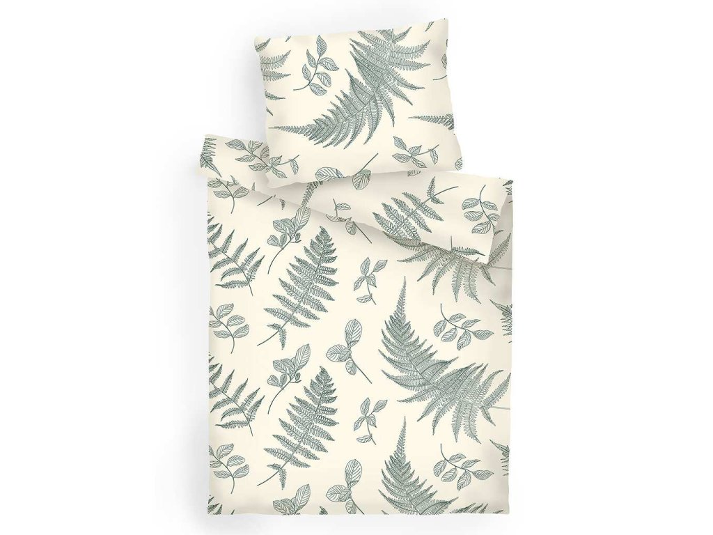 Flanelové povlečení Kapradí banán. Jemné zelené listy na smetanovém podkladu dodají vaší ložnici jemnost a eleganci. Povlečení doporučujeme kombinovat s banánovým prostěradlem. Rozměr povlečení je 140x200, 70x90 cm.