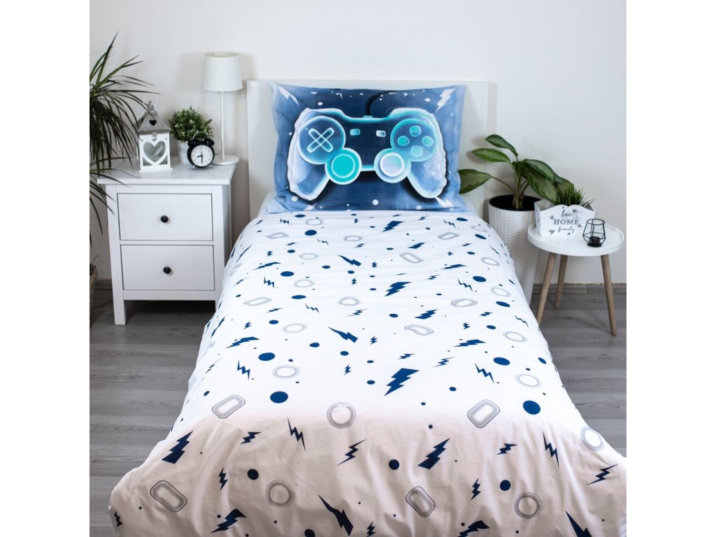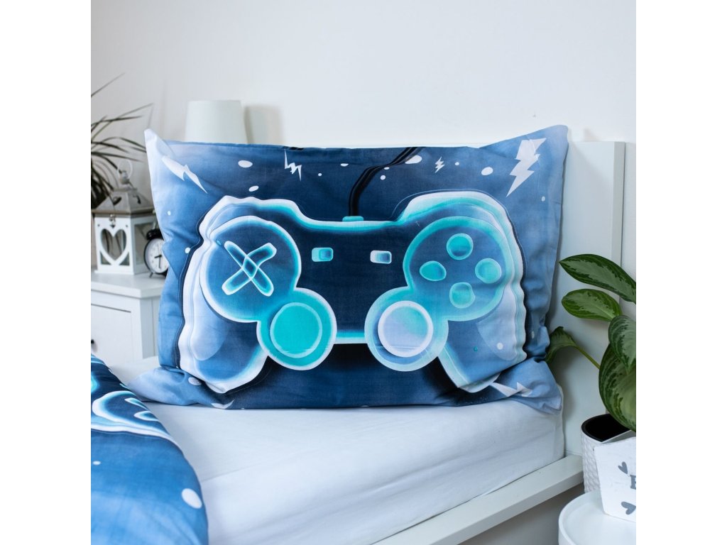 Vstupte do světa herních dobrodružství s povlečením Game Over! Stylový design s modrým herním ovladačem na tmavě modrém pozadí, doplněný bílými geometrickými prvky a blesky, přináší do každého pokoje energii, napětí a moderní atmosféru. Neonově modrý nápis „GAME OVER“ a otázka „PLAY AGAIN?“ dodávají celému setu hravý a originální vzhled, který potěší každého hráče.