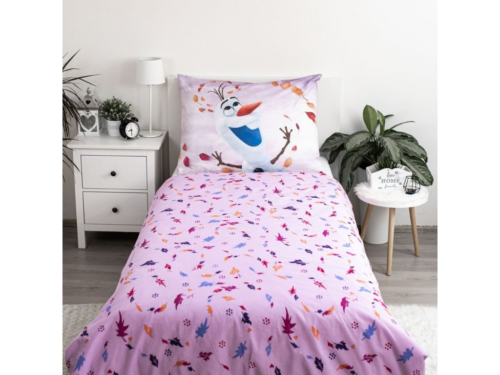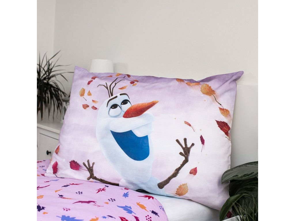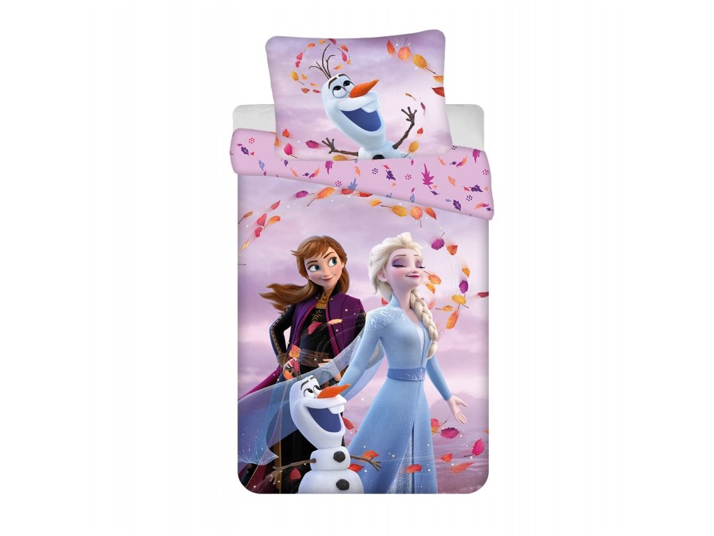 Povlečení s motivem Frozen 2 Sky. Rozměr 140×200 cm + 70×90 cm. Barevný potisk s postavičkami Olaf, Anna a Elsa obklopení podzimními listy na pozadí oblohy potěší každého malého fanouška.