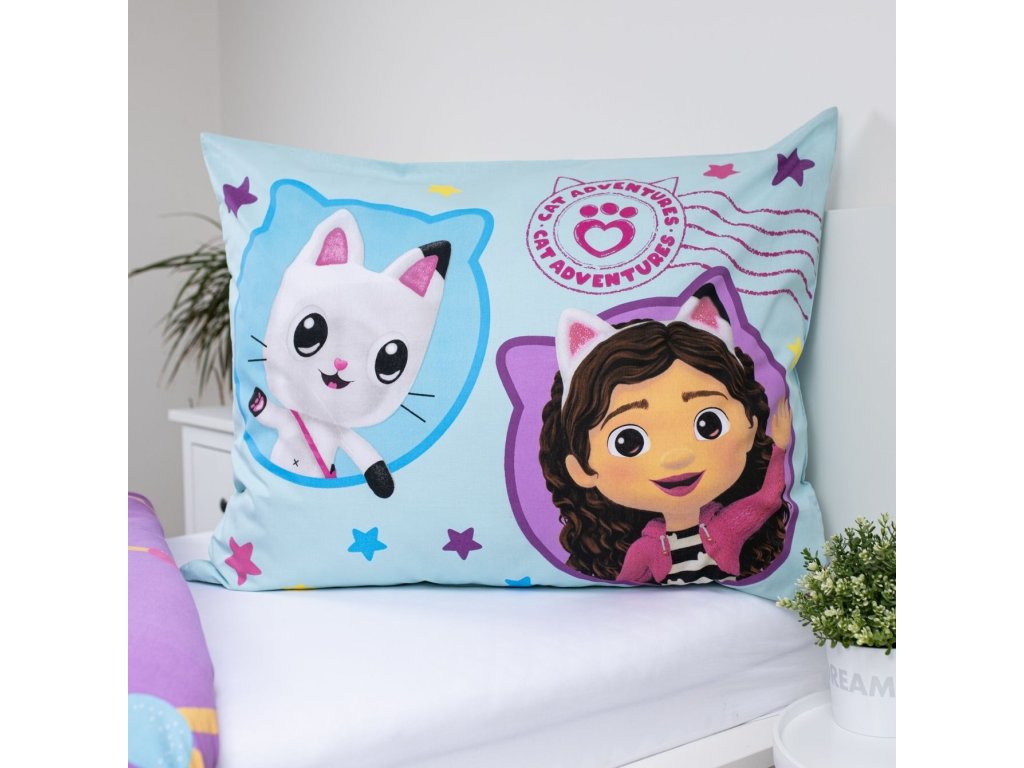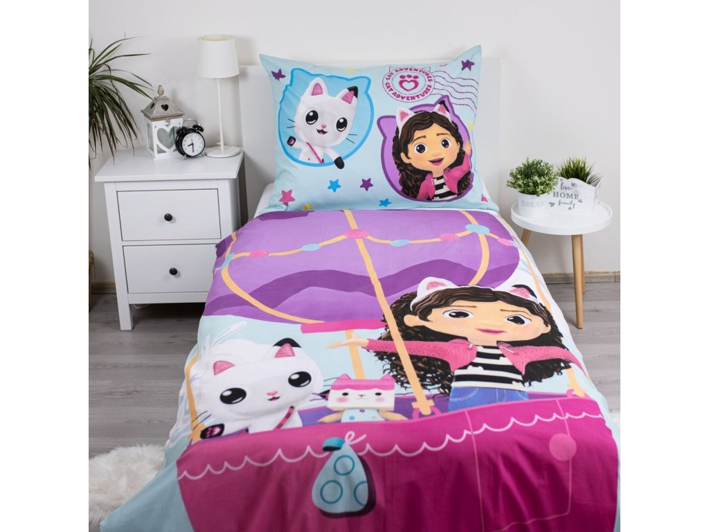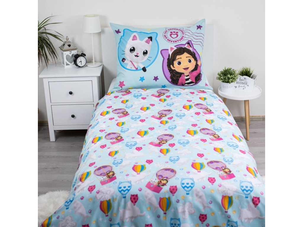 Povlečení s motivem Gabby's Dollhouse Balloon. Rozměr 140×200 cm + 70×90 cm. Barevný potisk s Gabby a jejími kočičími kamarády v horkovzdušném balónu na modrém nebi s obláčky potěší každého malého fanouška.