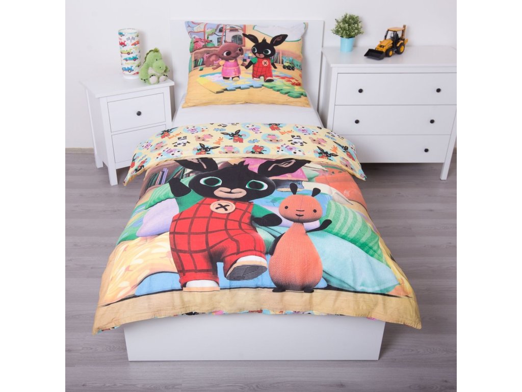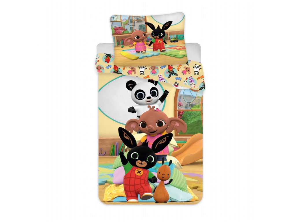 Povlečení s motivem Králíček Bing 051. Rozměr 140×200 cm + 70×90 cm. Barevný potisk s postavičkami Králíček Bing, Sula, Pando a Flop na barevném pozadí potěší každého malého fanouška.