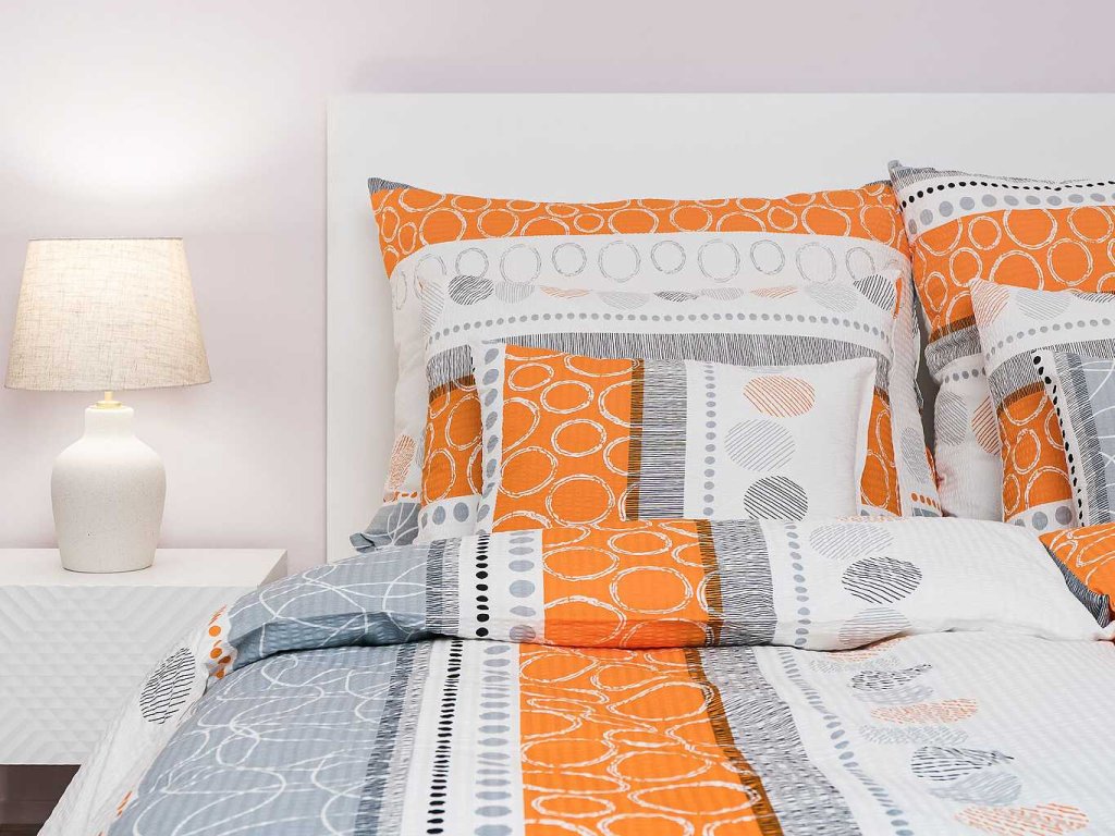 Moderní krepové povlečení Ateliér oranžový s kruhovým vzorem v oranžové, bílé a šedé barvě. Česká kvalita bez nutnosti žehlení. Rozměr povlečení je 200x200, 2x 70x90 cm.